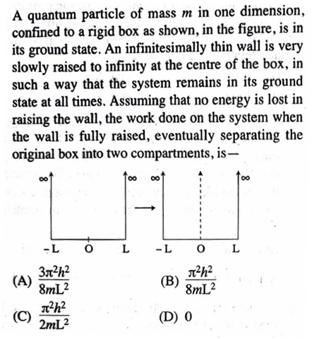 A Quantum particle of mass M in One dimension confined to a rigid box as shown in the figure is in its ground state. And infinitesimally thin wall is very well slowly raised to infinity at the centre of the box in such a way that the system remains in its ground state at all times as you mean that no energy is lost in raising the wall the work done on the system when the wall is fully taste eventually separating the original box into two Compartment