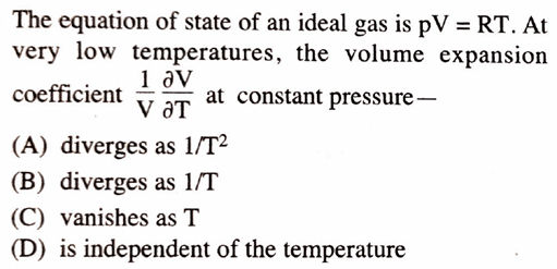 The equation of state of an ideal gas is PV = RT. at a very low temperature the volume expansion Coefficient at constant pressure…..